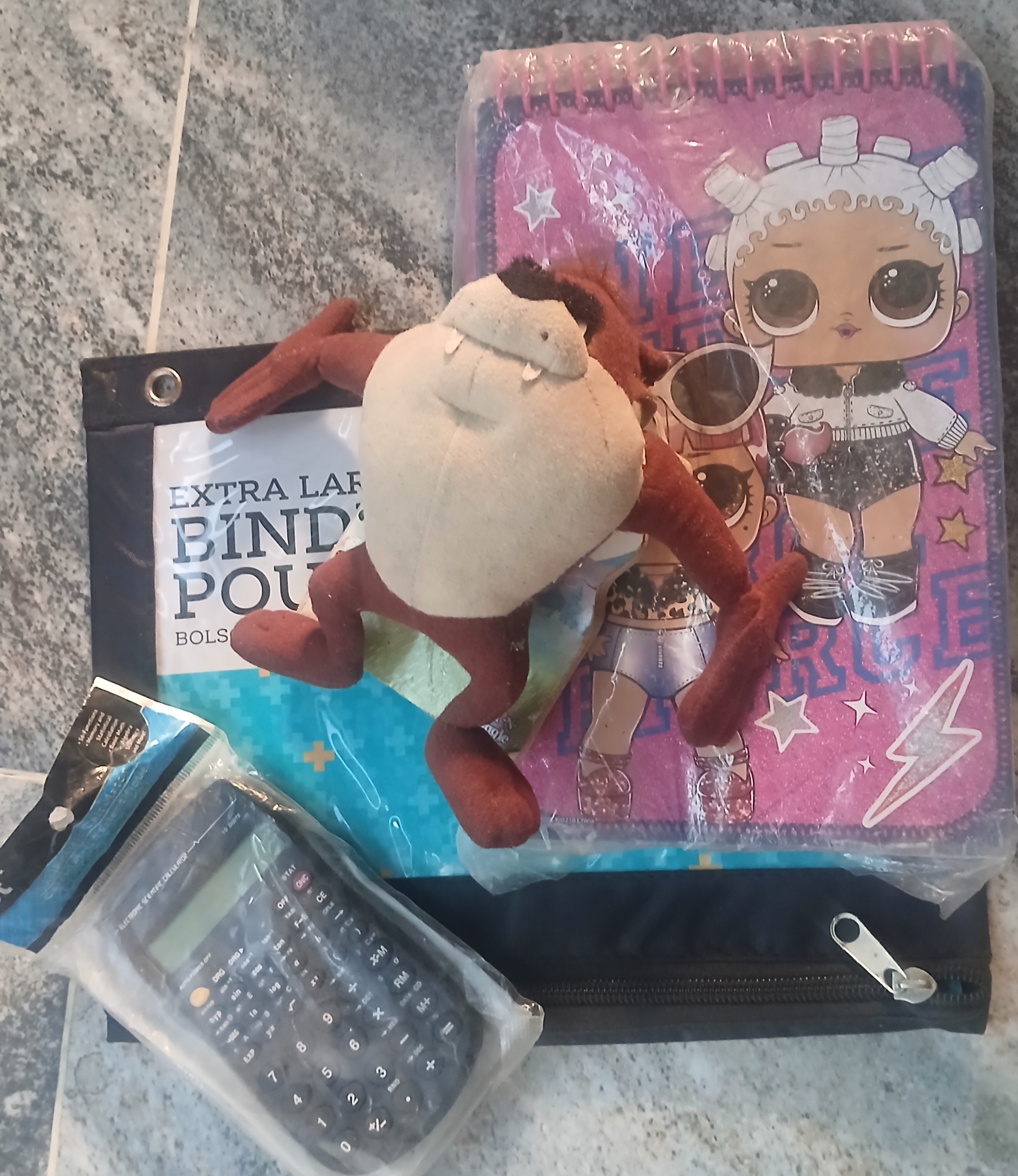 Calculator, Notepad, Pencil Case and Plush Toy all in one set.